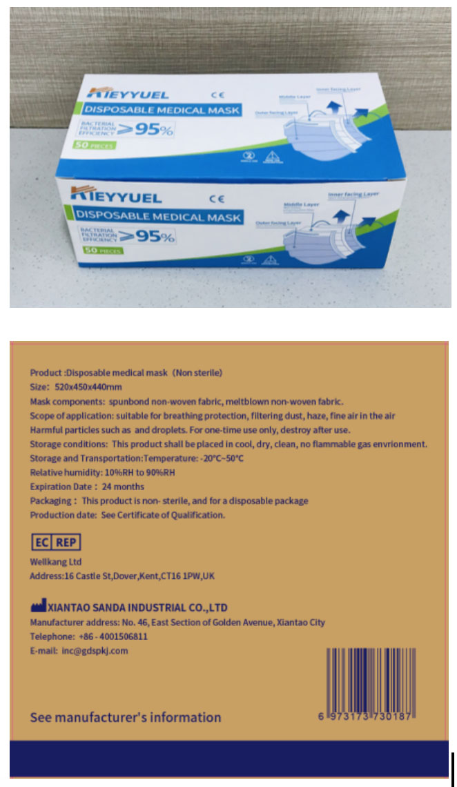 Einnota læknismaski, it is composed of two layers of fiber nonwoven fabric for medical and health care, with one layer added in the middle more than 99% of thefilter melt blown cloth is welded by ultrasonic wave.